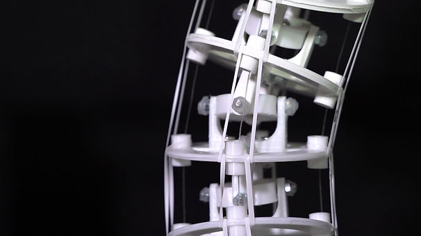 Knowing that we needed even expansion force between each axis of each vertebrae, we used strips of flexible PLA that we printed flat and then bent into place to expand the system. Tinkering with the length and thickness of these home-made "springs" allowed for bespoke control of expansion throughout the system.